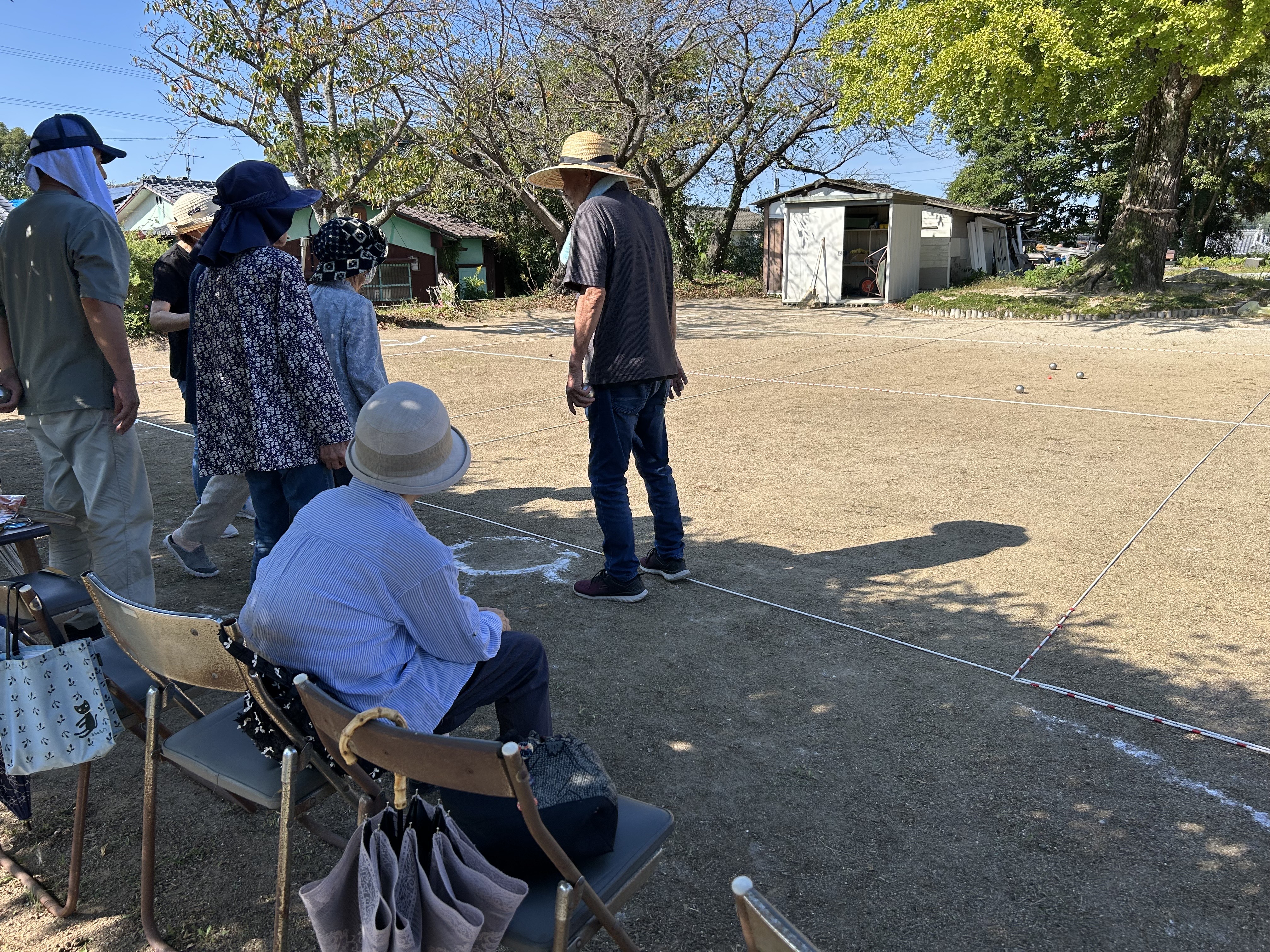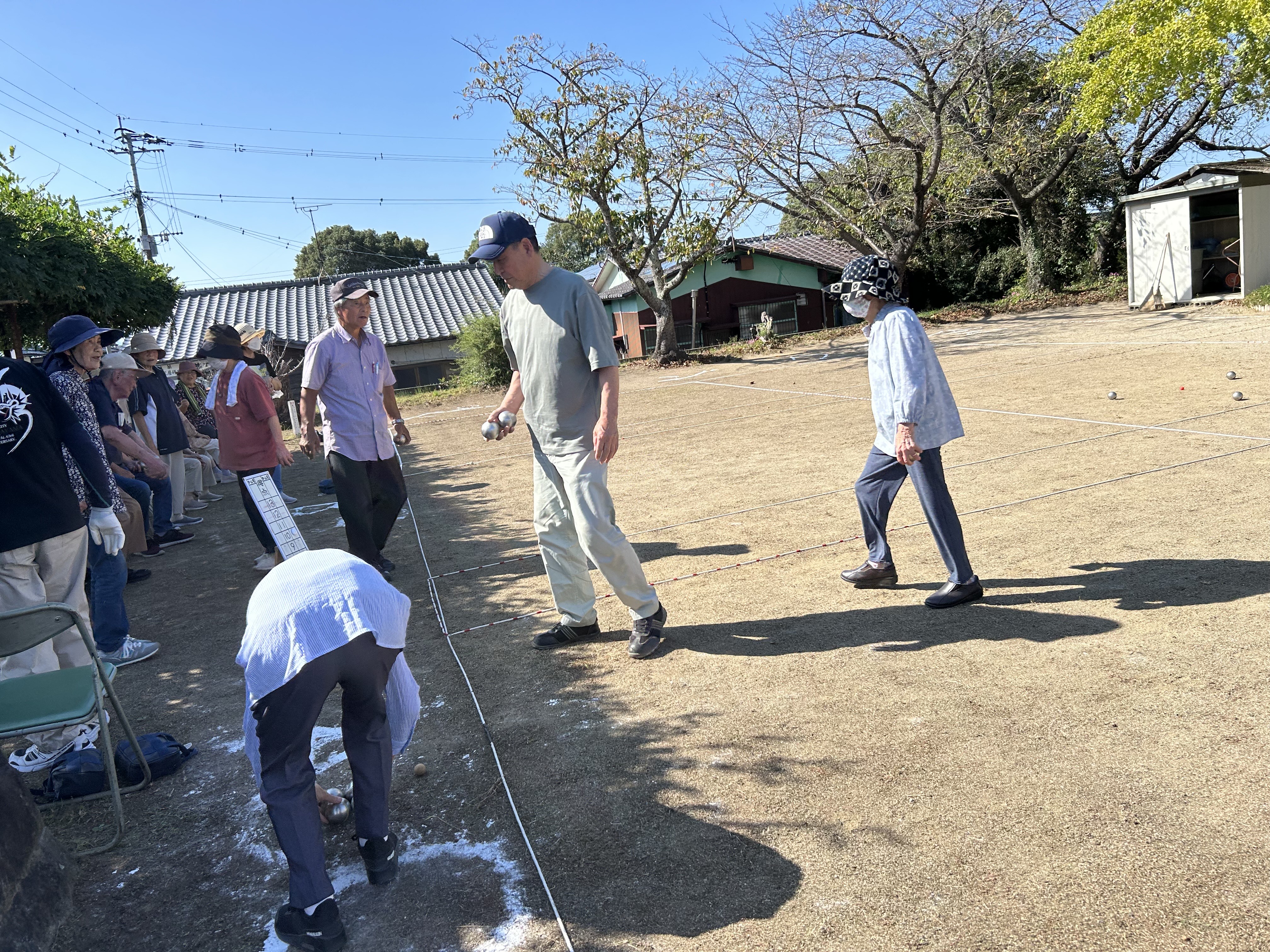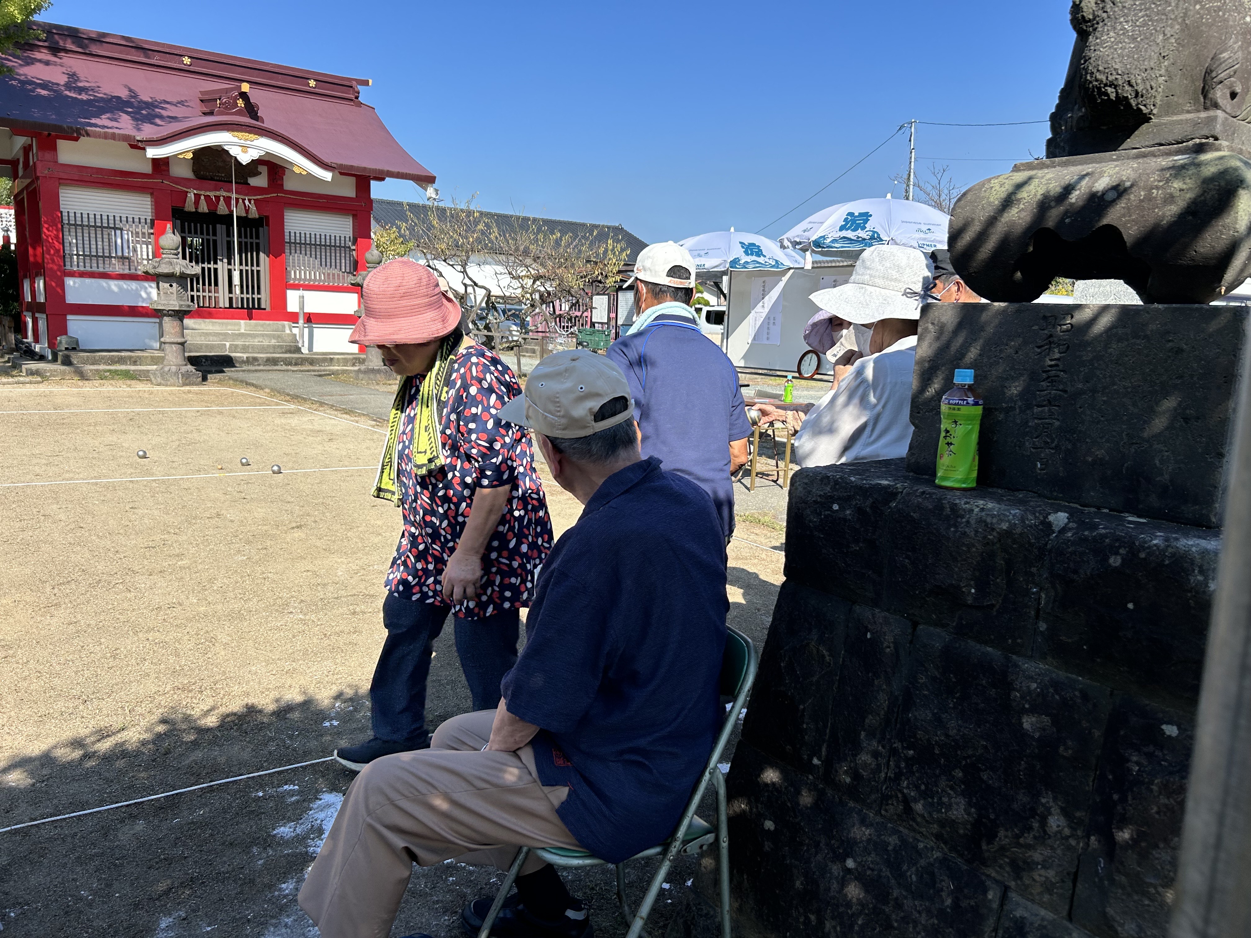 10月17日 藤田町公民館の皆さんと藤田天満宮前の広場に於いてペタンクを楽しみました。最初に挨拶をさせて頂きペタンクの開始となりました!