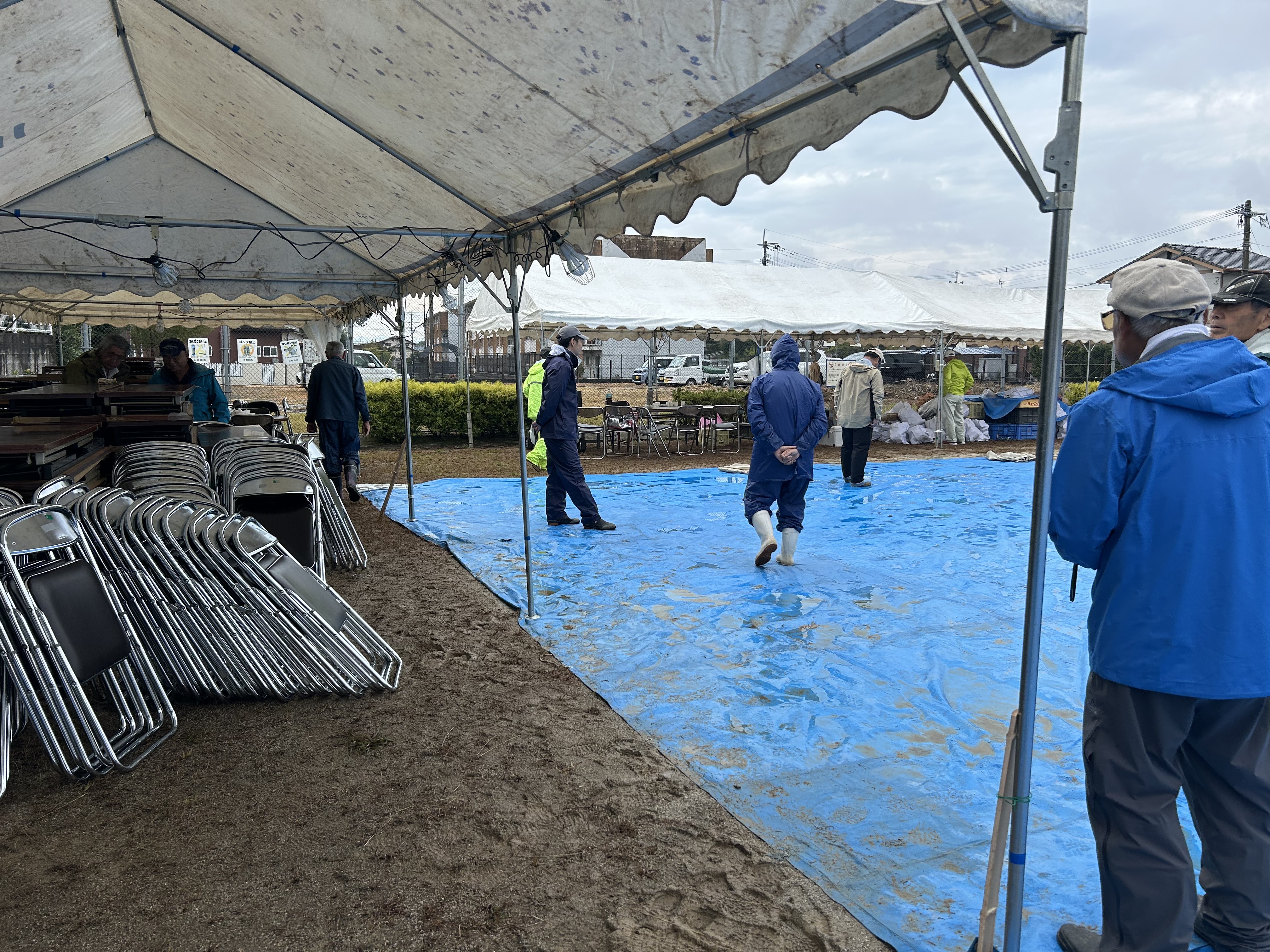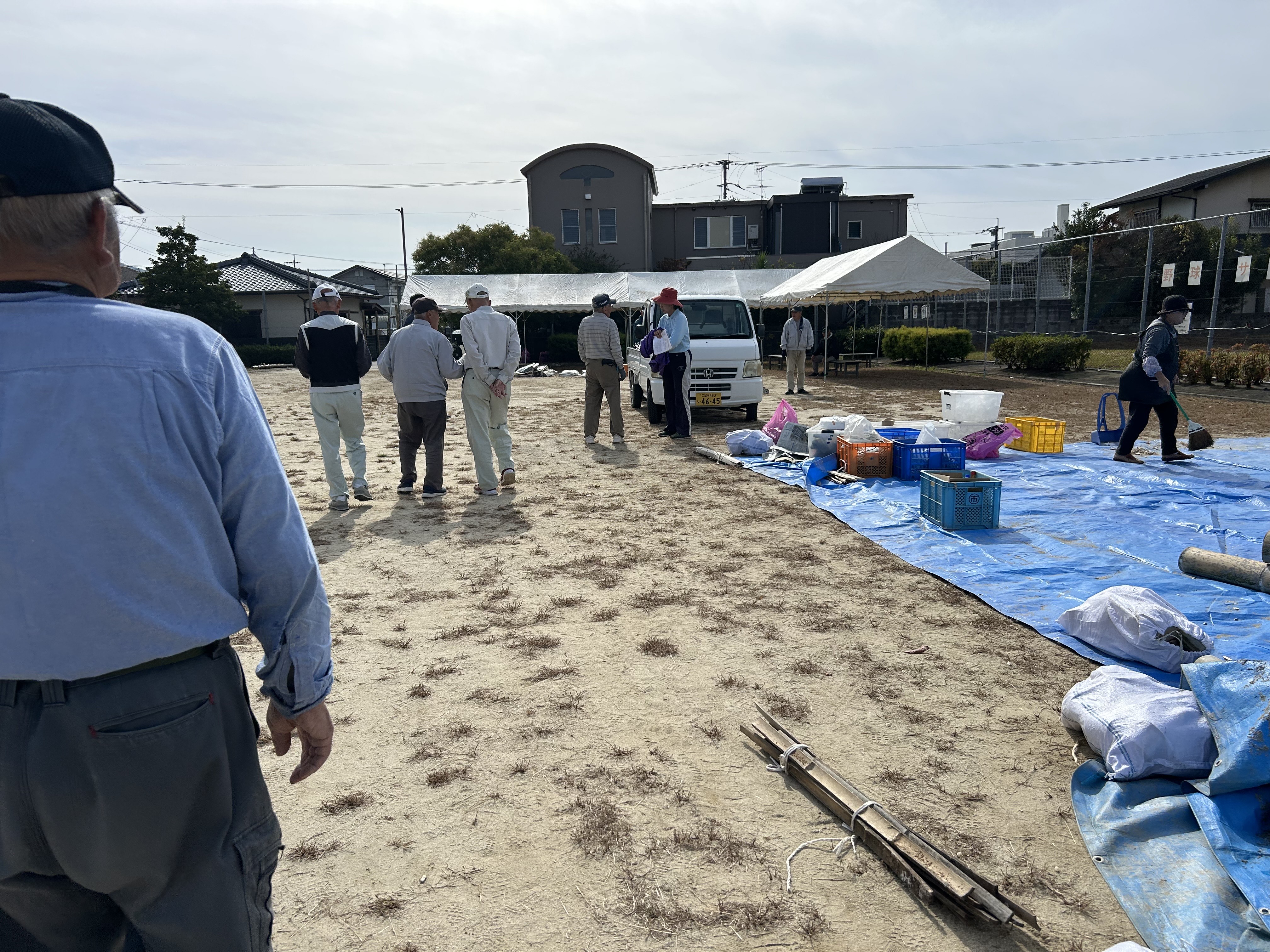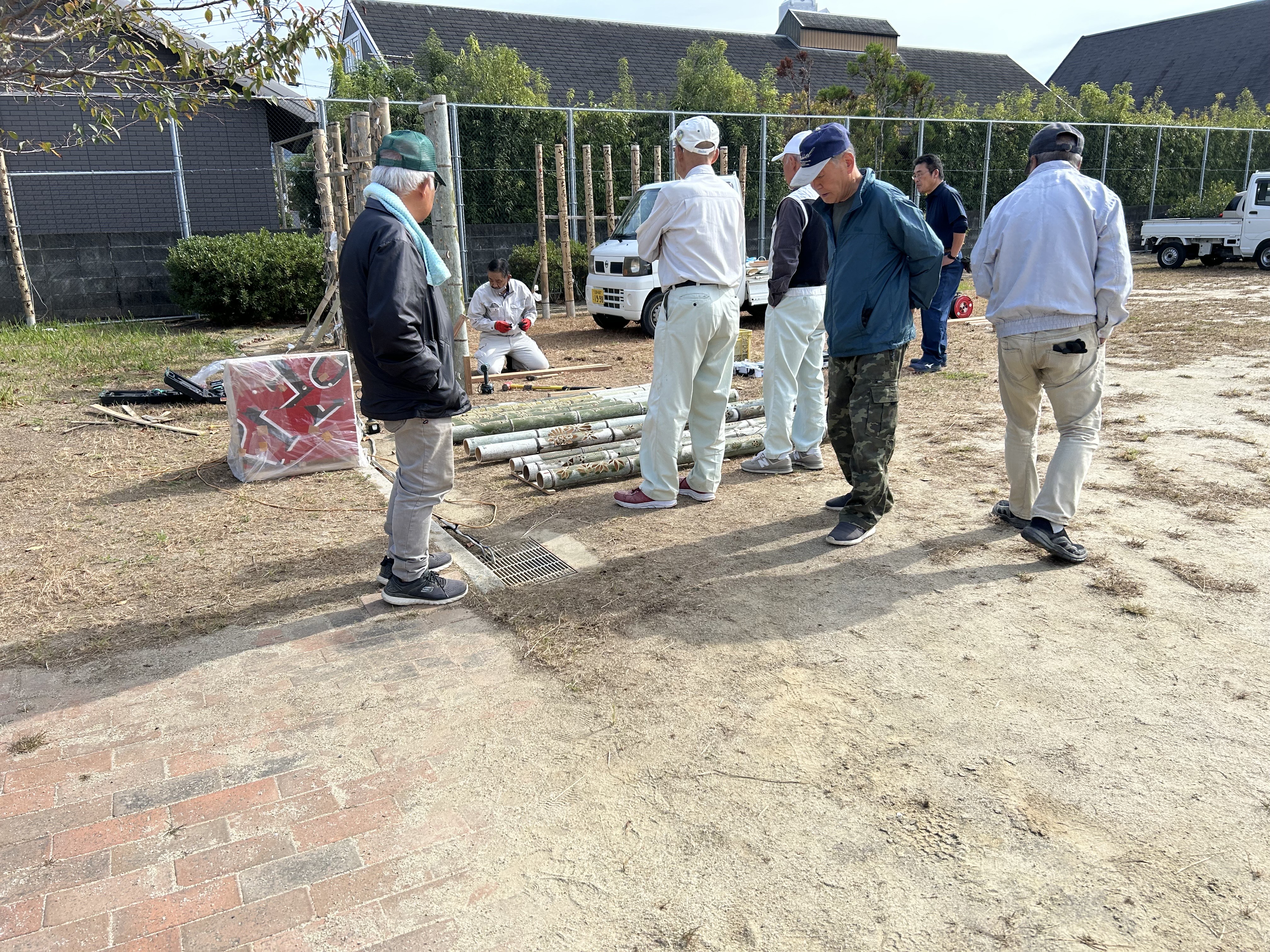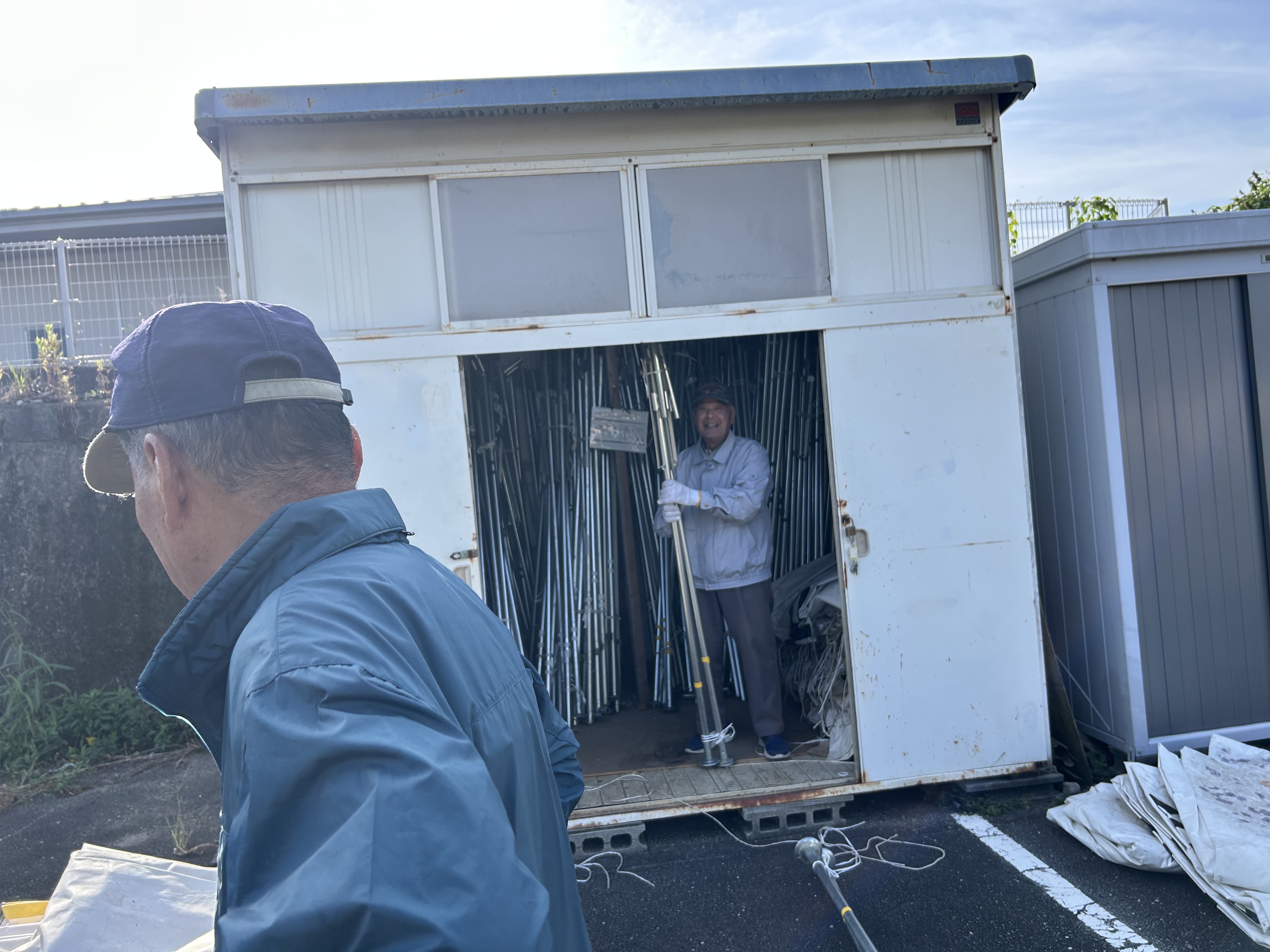 11月1日・2日に三池原公園にて開催される三池光竹2025の準備に向けて本来なら開催前日10月31日の準備予定でしたが、29日の夕方、会長から連絡があり31日の天気予報が雨予報なので30日にテントを立てるので三池原公園に午前9時集合で協力をお願いしますとのことでした!30日の参加は少なかったですが、かずやコスメディアの三池会館、第二駐車場に設置してある初市倉庫からテントを運び出し三池原公園に張りました。