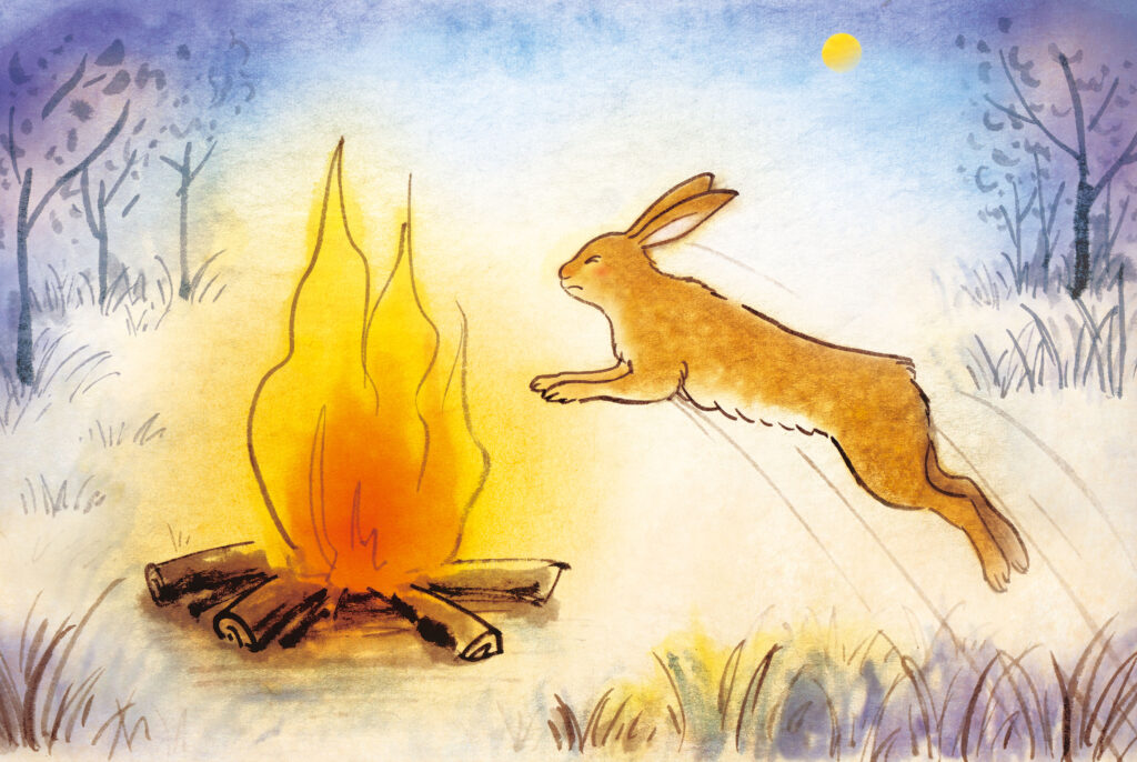 僧は三匹の友達が布施したものを食べるため、火をおこしました。それを見たウサギは喜び「私はあなたのために慈悲を施せる機会を失うことは出来ません。どうか私の施しを受け取ってください」と言った瞬間、火に飛び込みました。