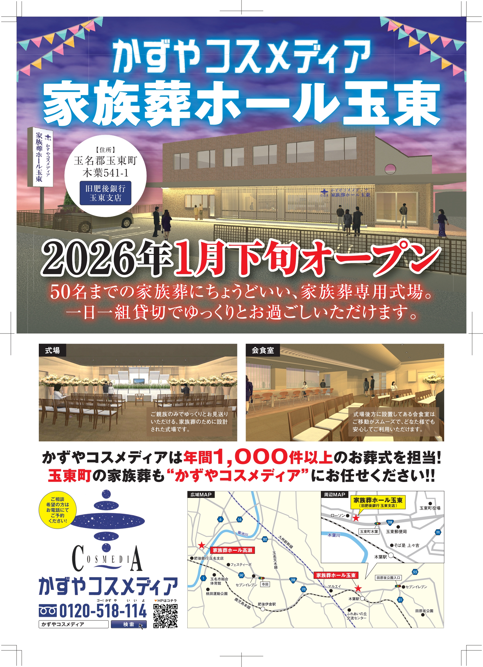 また、先日のブログでもお伝えしていましたが、2026年1月19日に【家族葬ホール玉東】が玉名郡玉東町に新たにオープンいたします!