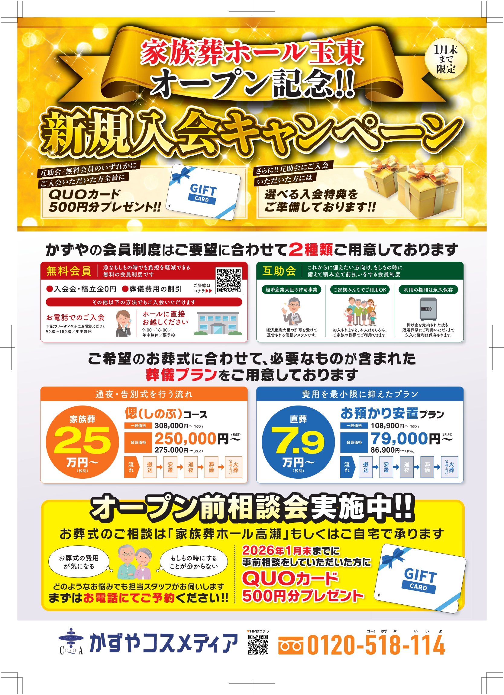 仮会員(無料会員)、互助会のいずれかにご入会いただいた方にQUOカード500円のプレゼント、互助会にご入会された方にはさらに!!選べる特典もご用意しております!